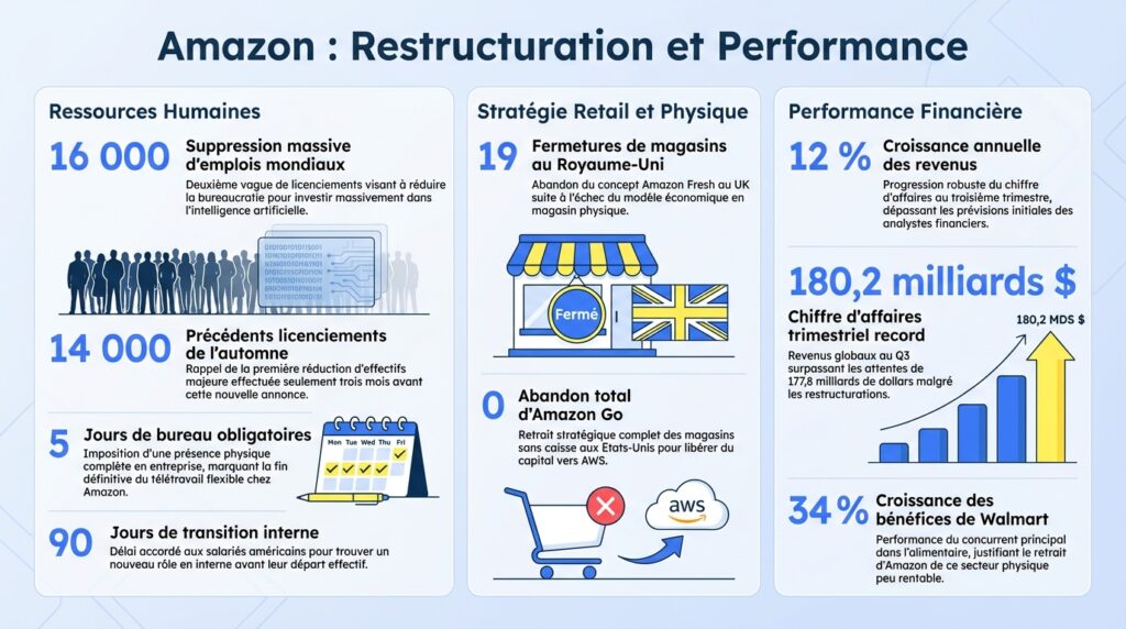 Nous assistons à un remaniement spectaculaire chez le géant du commerce électronique. Amazon est au milieu d’une restructuration stratégique de grande ampleur, impactant à la fois ses effectifs mondiaux et son modèle commercial. Dans cet article, nous allons analyser les trois piliers de ce changement : la suppression de 16 000 emplois, le retrait des magasins physiques Amazon Fresh et Go, et le lancement audacieux d’un nouveau service premium, Amazon Now, dédié à la livraison ultra-rapide.
