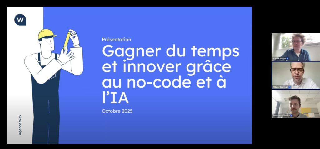 Ce webinaire a réuni trois intervenants de l’agence WEX : Olivier Sauvage, directeur de l’agence, Mathieu Gameiro, lead développeur No-Code, et Cyrille Pattyn, codirecteur de l’agence et responsable des projets.